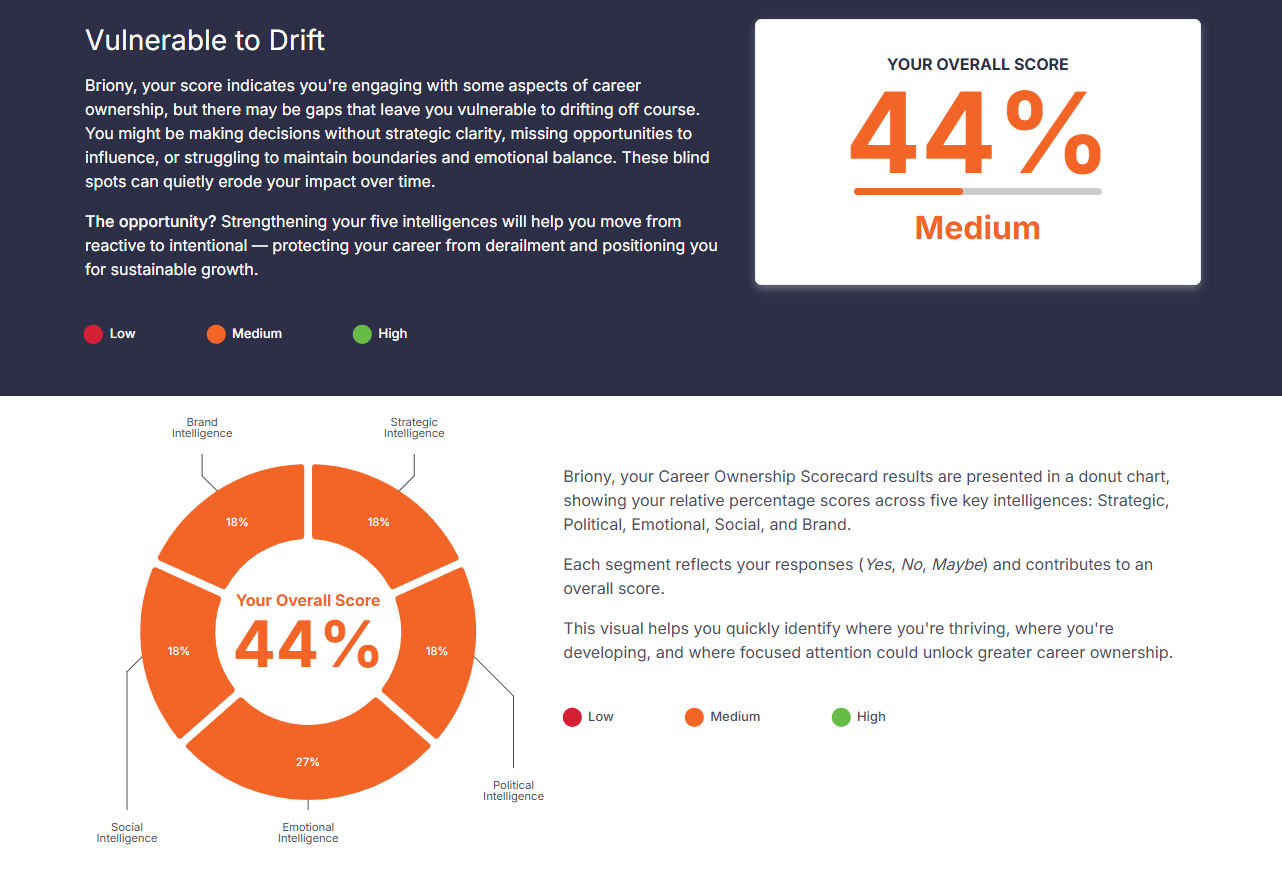 Completing this scorecard will help you pinpoint five key areas where unconscious behaviours may be quietly derailing your career — and where greater career ownership will unlock clarity, influence, and growth.